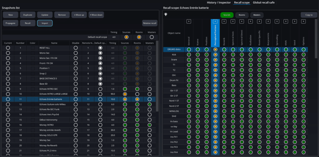 While previous version of SPAT Revolution allowed a user to scope the parameter category (source, room and masters) for each snapshot recall, this new deep snapshot advancement allows the user for a deeper scope of recall with a deeper level of parameter granularity that can be applied global or per snapshot. The new global recall safe can allow the same level of granularity, but specific to specific parameters to never be recalled.